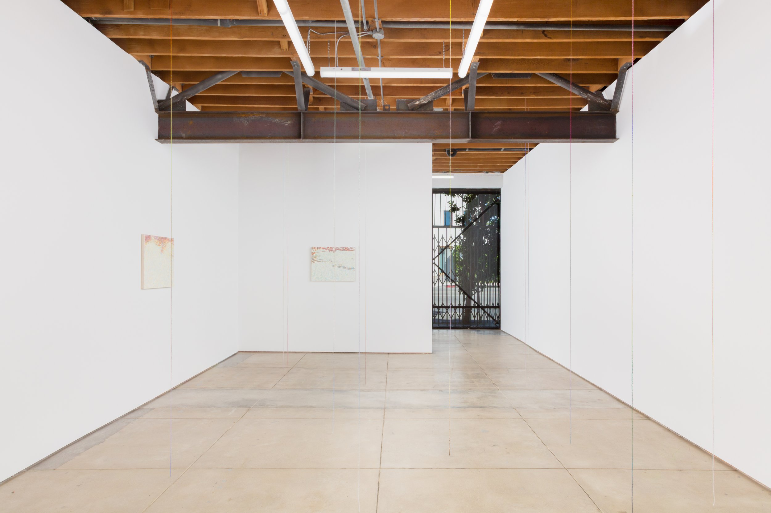 Always installed in conversation with the site of their presentation, the strands activate the idiosyncrasies of the gallery’s ceiling. Hovering just above the ground, the works appear to fall like stray light from cracks in the wooden ceiling. One final gesture, a field recording of a Midwestern nightscape, floats through the gallery. The sound of cicadas at night, their murmurings like tiny bells tolling on an infinite plane, draws the whole space into harmony.