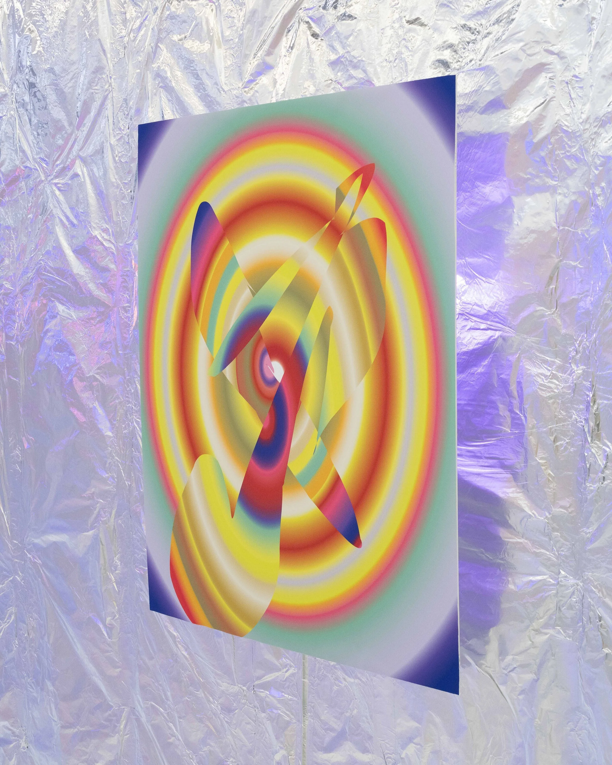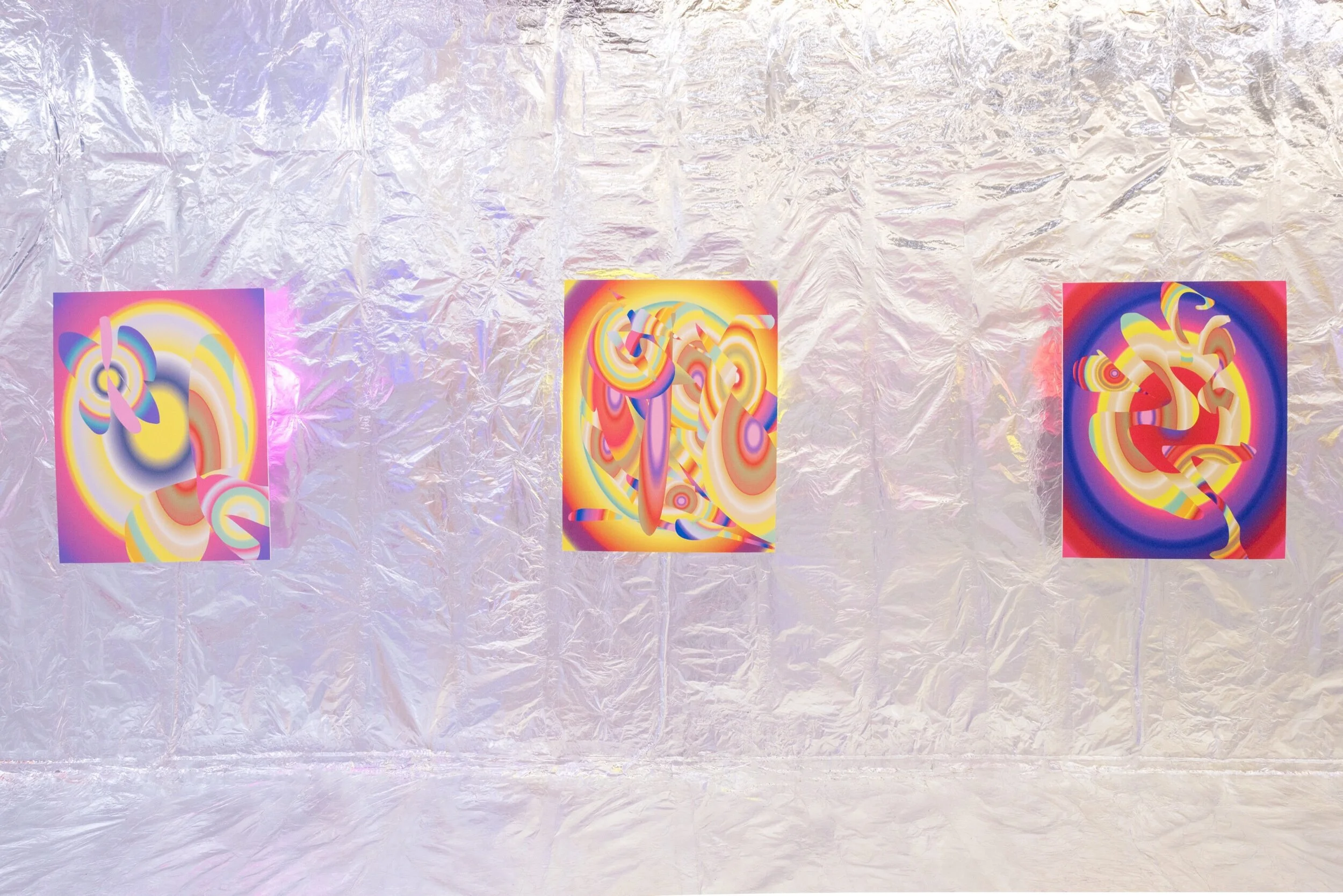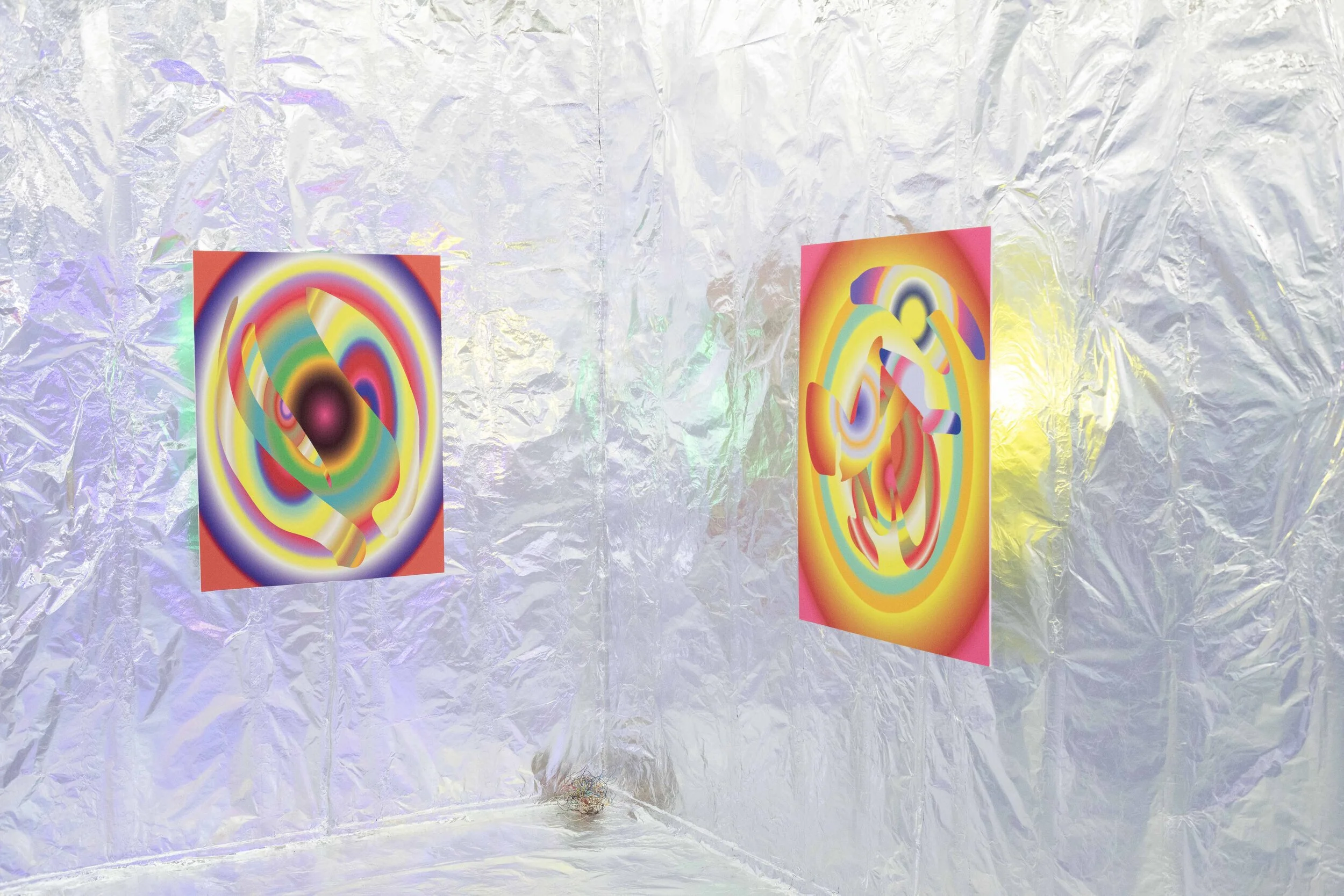 metronome consists of a series of 11 large scale digital pigment prints, one large-scale wire sculpture, and a small mockett wire sculpture. walls, ceiling and floor have been covered in aluminum foil to create an immersive environment, as the backlit prints appear to float off the walls and reflect their images on empty walls. the space is filled with the sound of an echoed metronomic water droplet playing on a loop in the background. Influenced by the warming gesture of a metronome, repetition, and the stability of time, the work visually references interference patterns caused by ripples on the surface of water. Colorful and optically charged, the works play with the flattening of space and the effect of pattern and recursive gestures. viewers are invited to enter the space with their shoes removed.