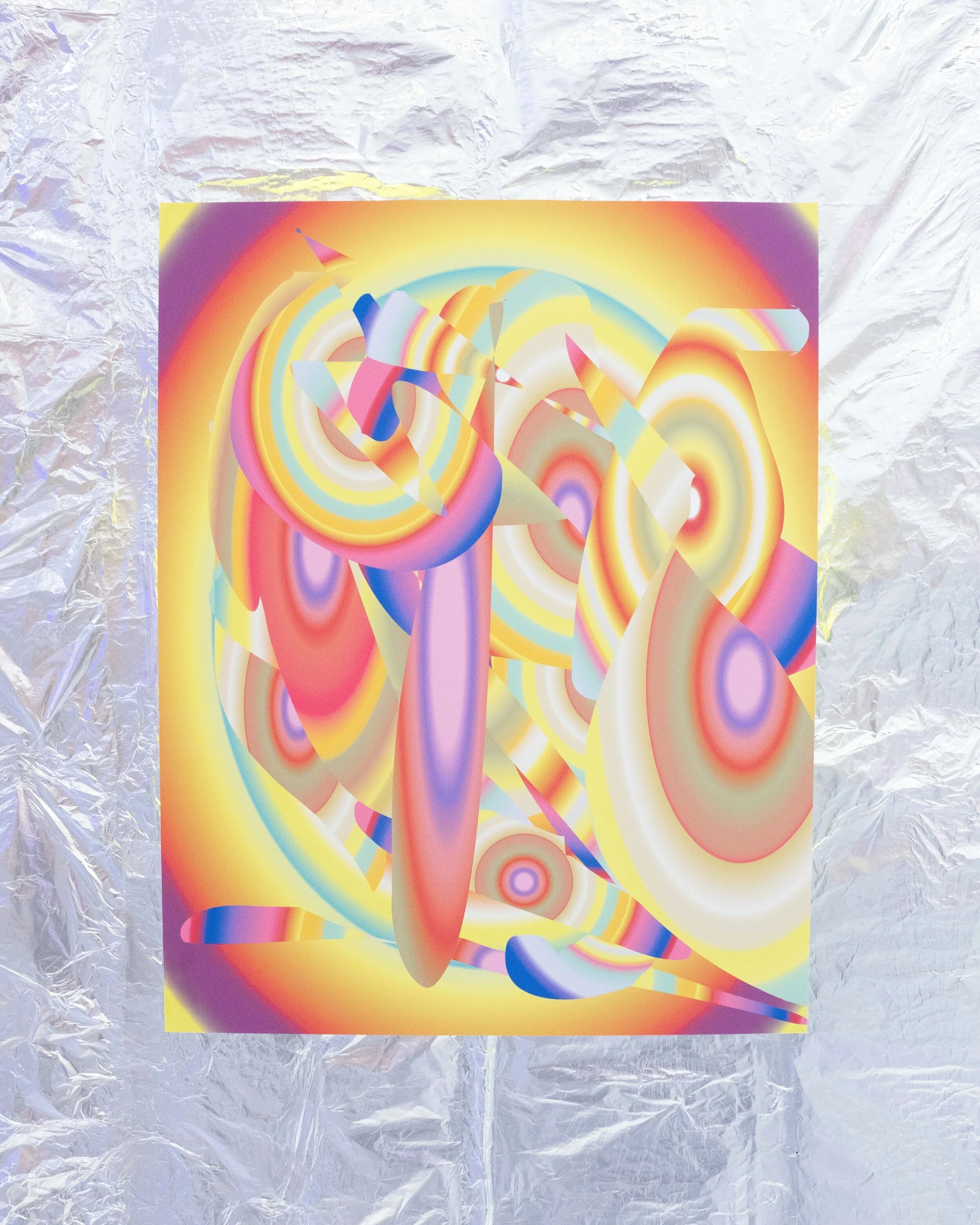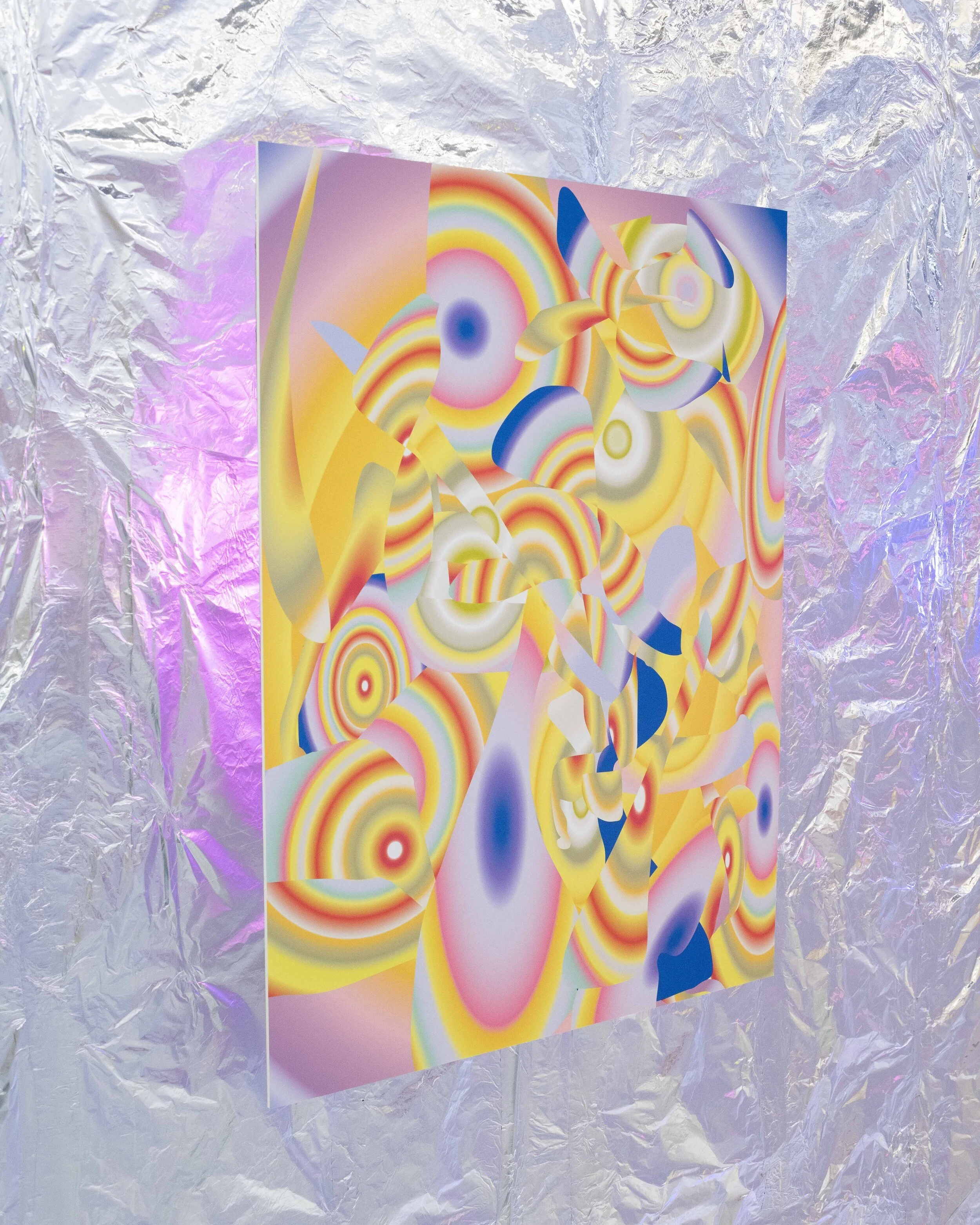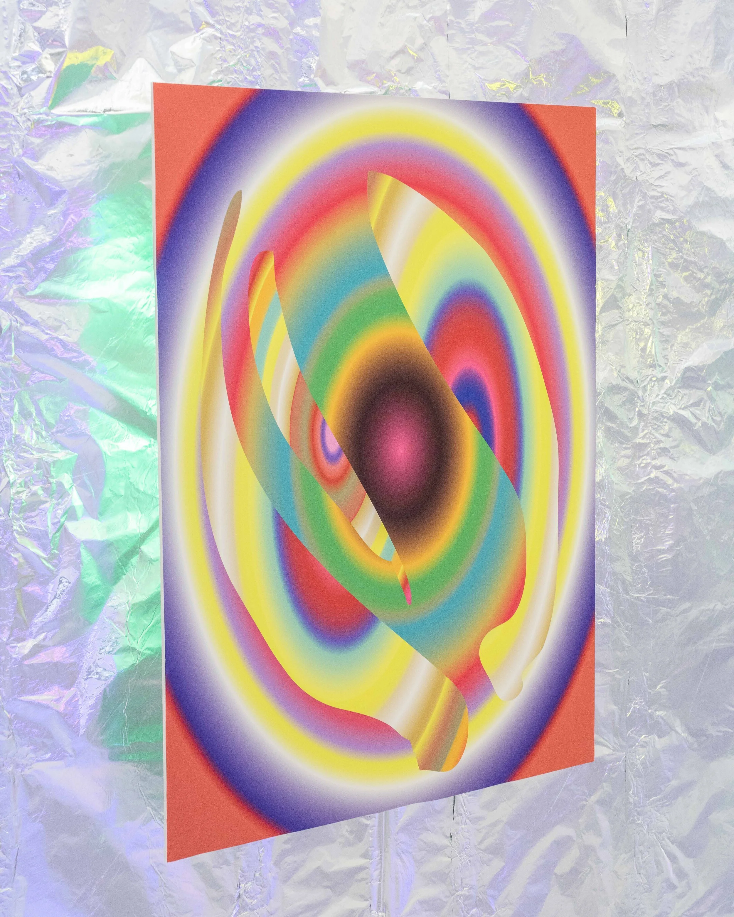 metronome consists of a series of 11 large scale digital pigment prints, one large-scale wire sculpture, and a small mockett wire sculpture. walls, ceiling and floor have been covered in aluminum foil to create an immersive environment, as the backlit prints appear to float off the walls and reflect their images on empty walls. the space is filled with the sound of an echoed metronomic water droplet playing on a loop in the background. Influenced by the warming gesture of a metronome, repetition, and the stability of time, the work visually references interference patterns caused by ripples on the surface of water. Colorful and optically charged, the works play with the flattening of space and the effect of pattern and recursive gestures. viewers are invited to enter the space with their shoes removed.